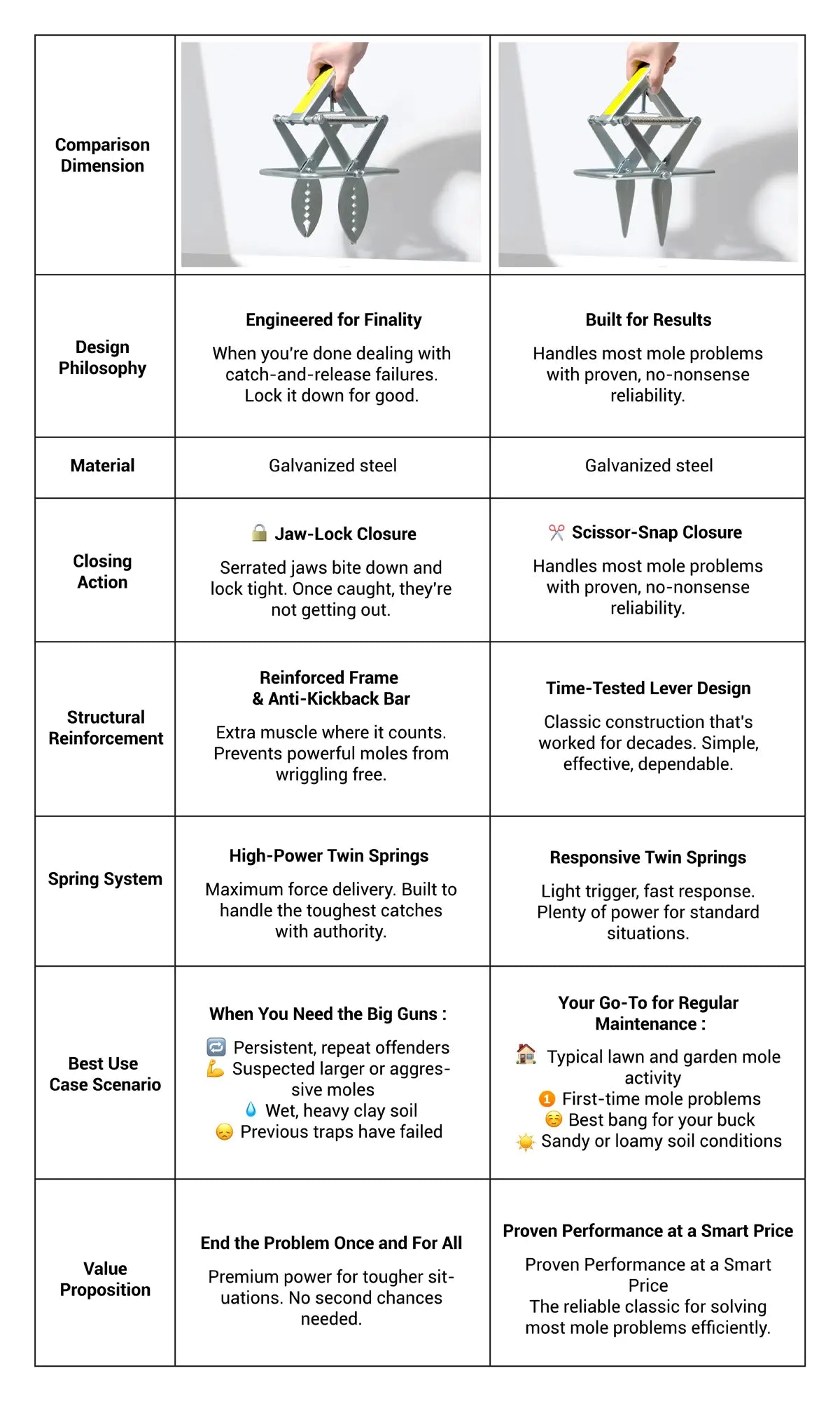 Reusable and heavy-duty, chemical-free, and effective in all soil types for safe, eco-friendly mole control.