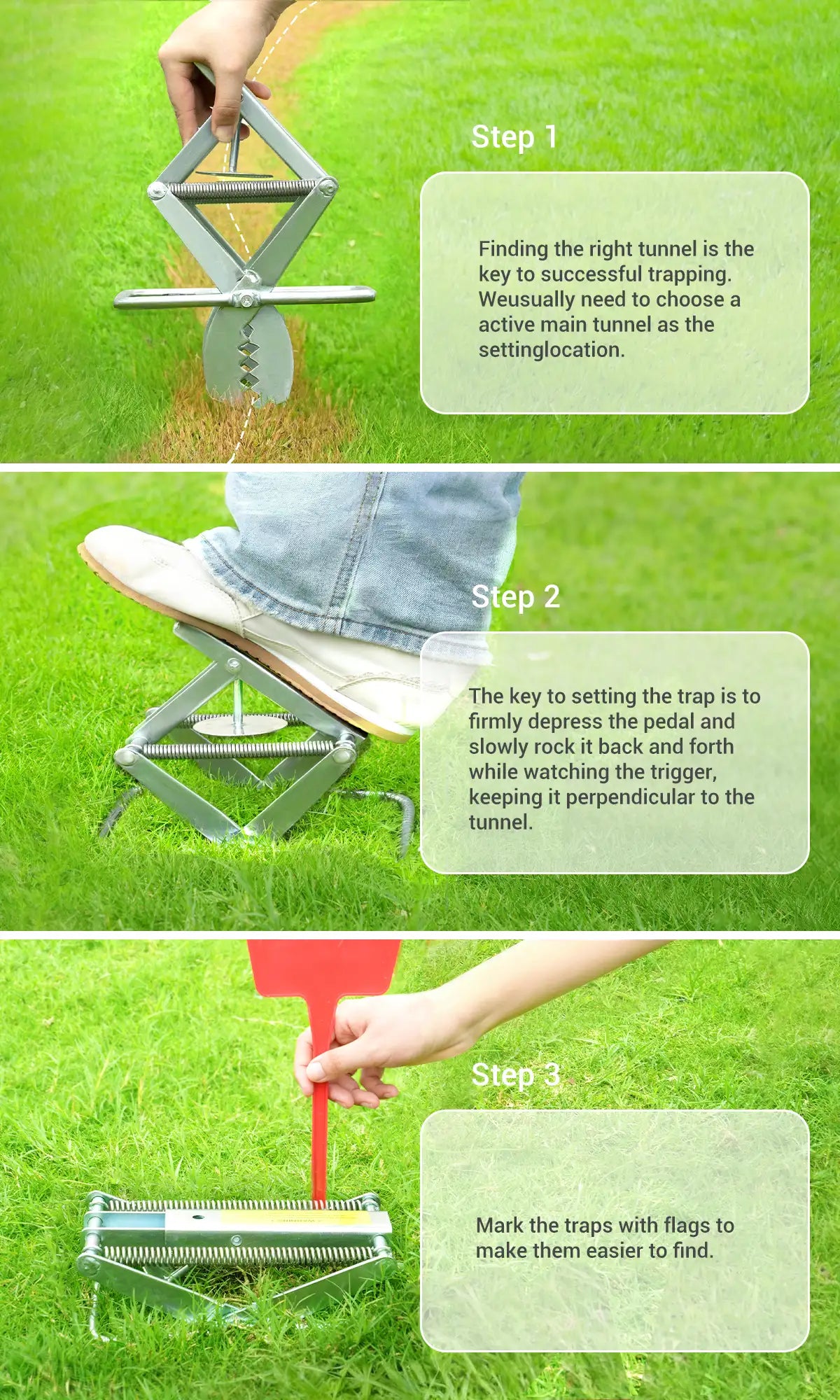 • Tool-Free One-Step Setup – Just step to set, no digging, bait, or tools needed. Perfect for anyone who wants quick, mess-free mole control.